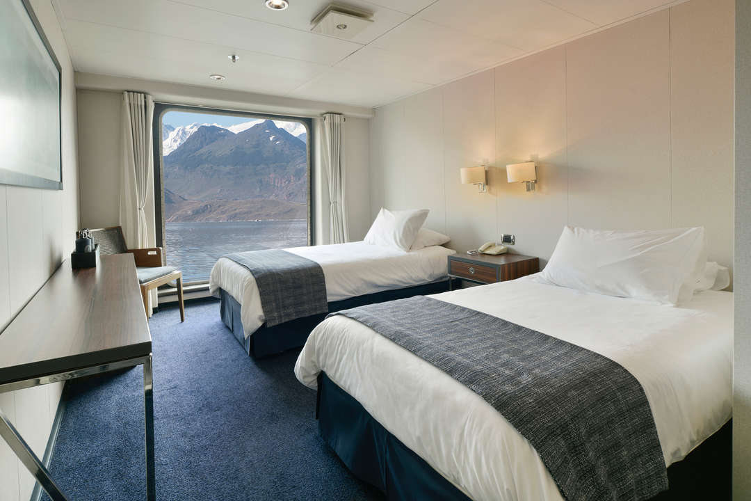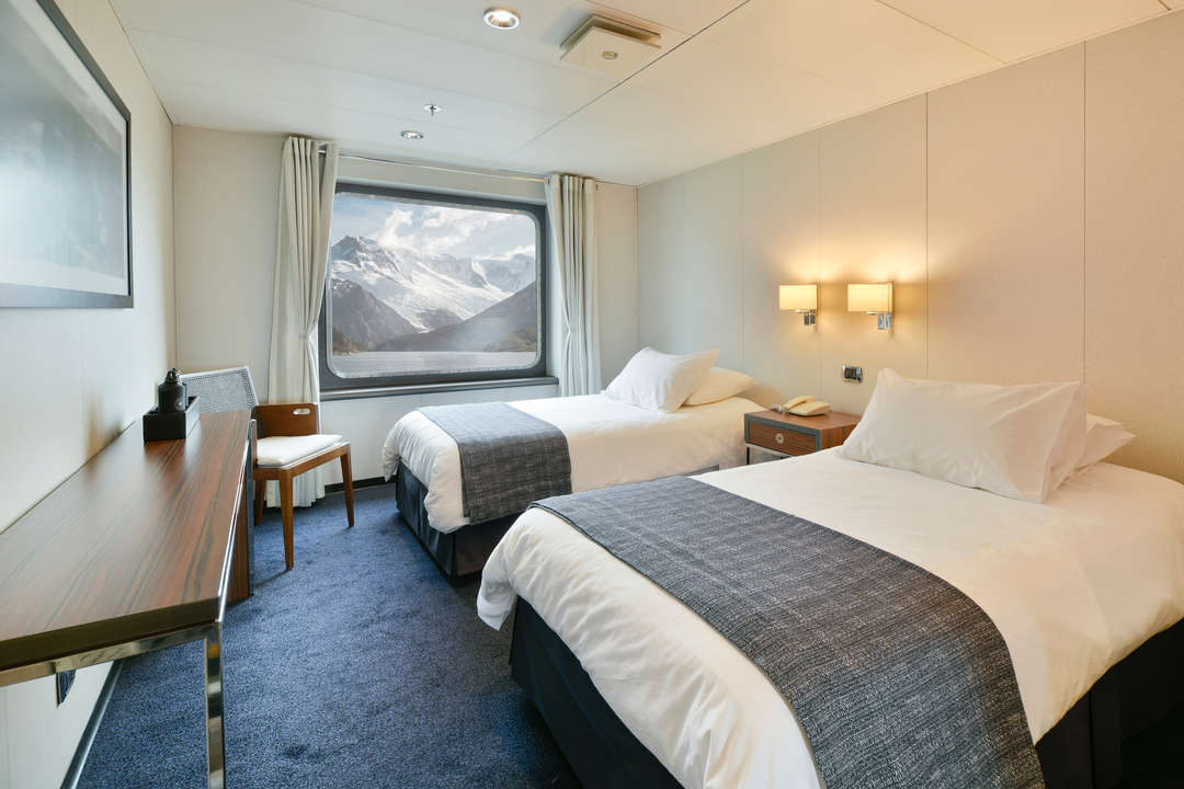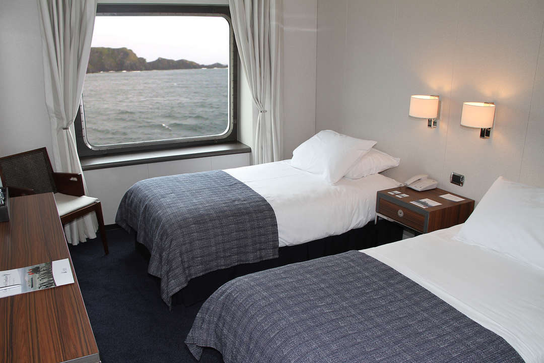 All cabins feature windows and are furnished with two twin beds, independent heating, a safe, and a closet. Each cabin also has a private bathroom equipped with a hairdryer. Electric power is 110–220 V.