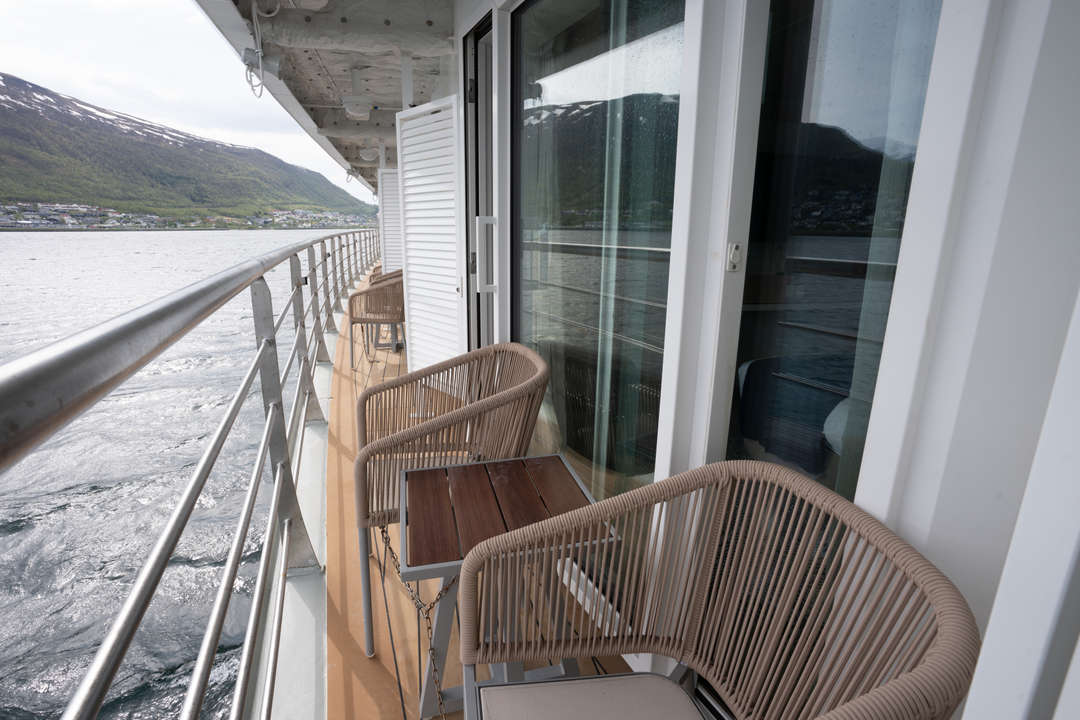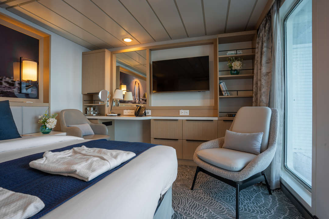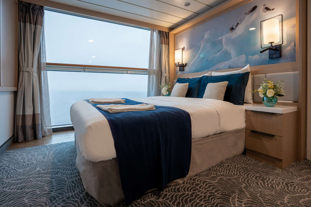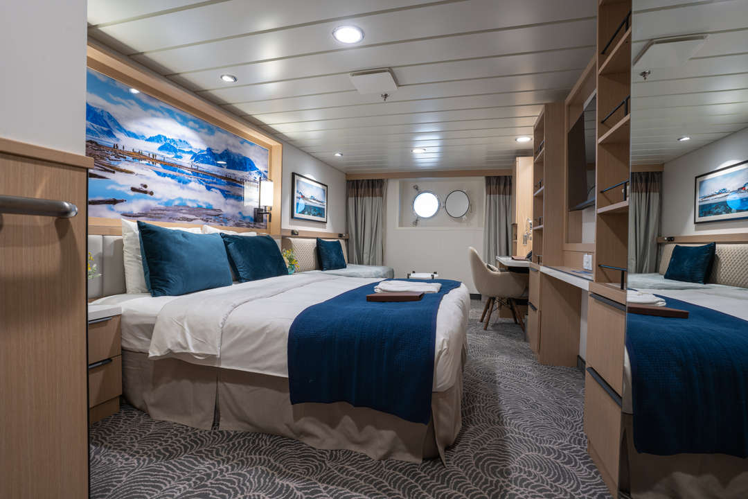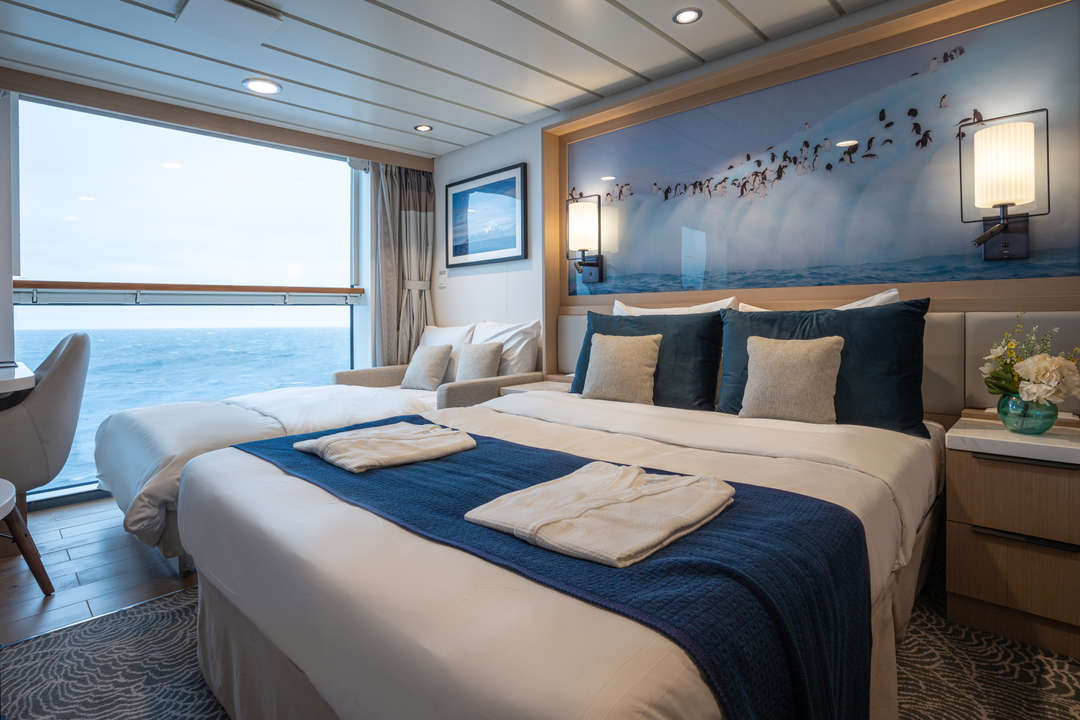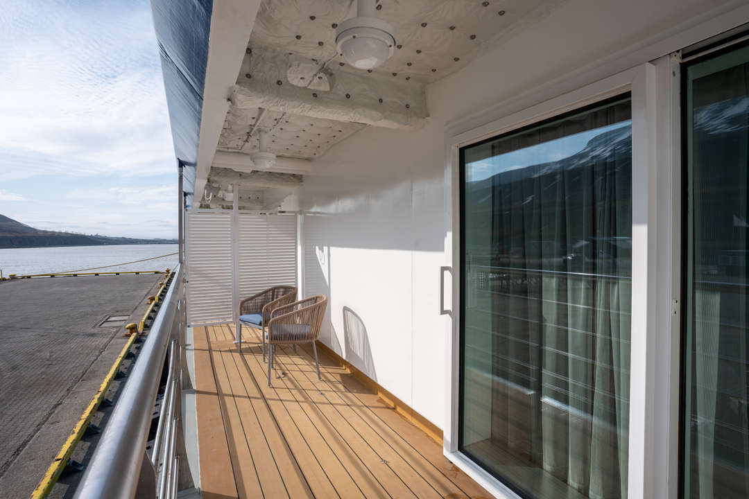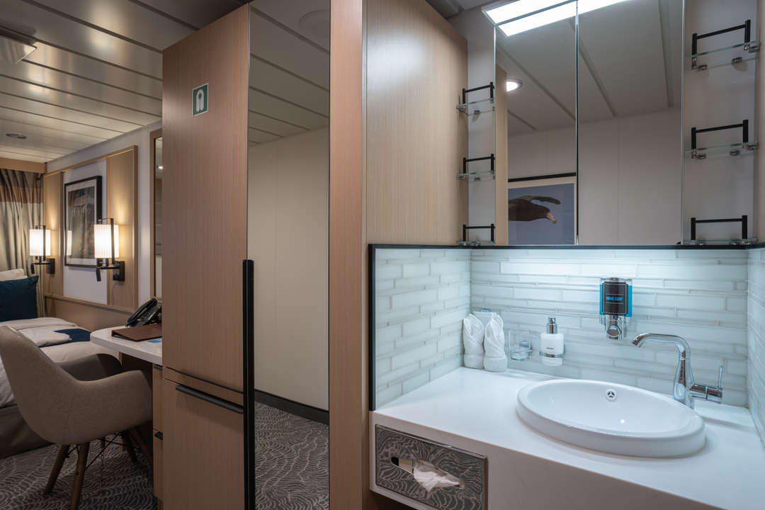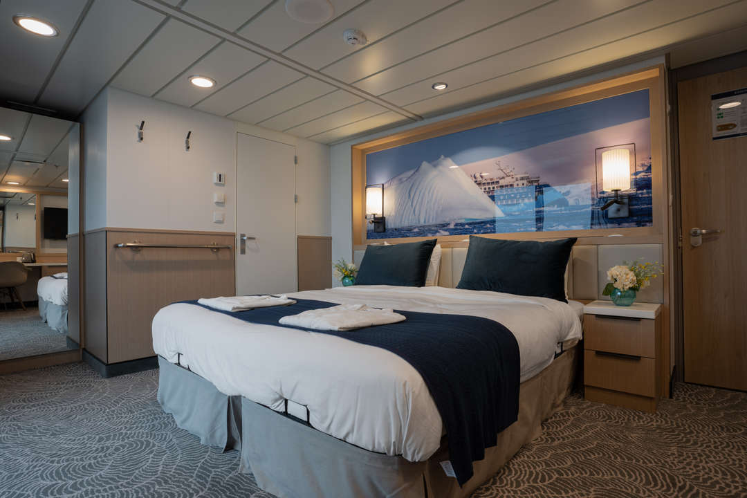 The Ocean Albatros is a 104-meter/341-foot-long cruise ship with luxury amenities, taking 169 guests on an adventure through the Arctic region. This luxurious ship features 94 comfortable staterooms and suites with unobstructed sea views. Most rooms have a private balcony, making it the perfect spot to watch the Northern Lights or enjoy the midnight sun. There are two restaurants, a wellness area, an Albatros Nordic Bar, an open deck dining facility, a modern lecture lounge, and many other state-of-the-art amenities. The Ocean Albatros is also 50% more environmentally friendly than traditional expedition vessels,