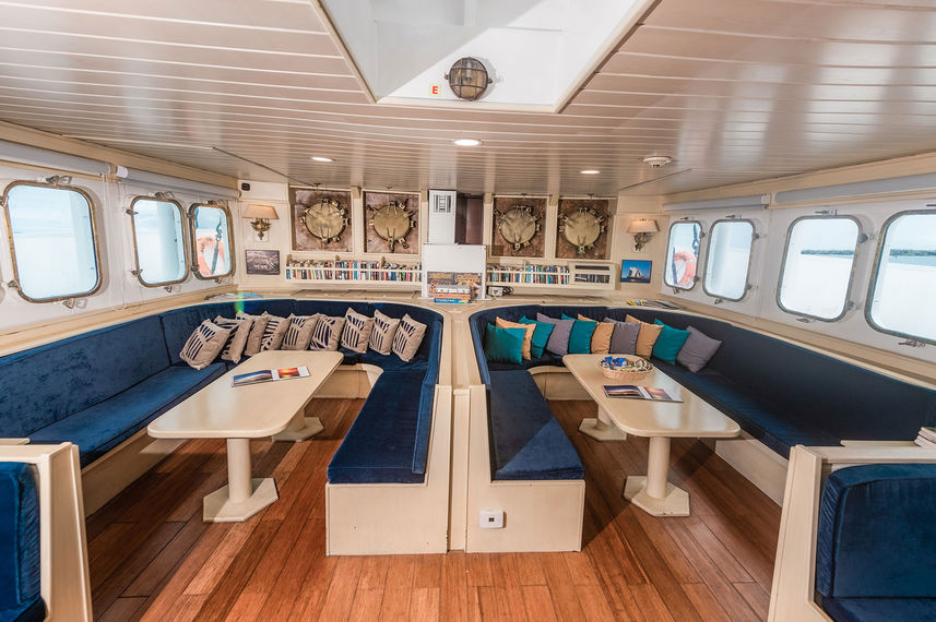 Catering to a maximum of 16 guests, the S/S Mary Anne Galapagos offers 6 double and 6 single cabins. All cabins have private bathrooms with hot water and are designed with one double lower berth and a single upper berth, and two cabins have lower berths. Because the SS Mary Anne was built for 24 guests but caters to a maximum of 16, there is plenty of space to relax. Guests can choose the sun deck with open-air seating or the bridge to enjoy the fresh sea air. The dining room, kitchen, lounge, entertainment area, and library are on the main deck. Meals can also be served al-fresco to enjoy the stunning Galapagos views and sunsets. Enjoy international and local Ecuadorian cuisine with freshly sourced ingredients.