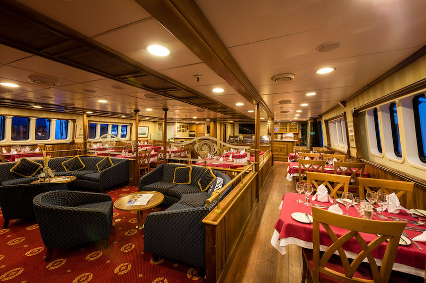 As áreas sociais incluem um lounge com biblioteca, com janelas do chão ao teto para excelentes vistas das ilhas ao passar. Uma grande sala de jantar interna permite que os hóspedes desfrutem das refeições preparadas a bordo com conforto. No convés superior há um bar ao ar livre e uma área de lounge, proporcionando um ótimo lugar para se misturar com outros hóspedes ou simplesmente relaxar à noite. Outras áreas externas incluem um deck ao ar livre e um deck de popa com sombra para aproveitar o sol local.