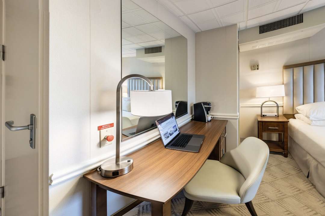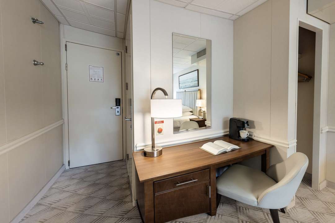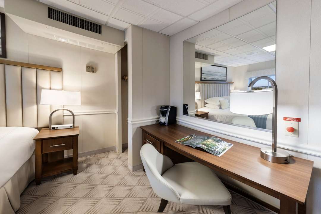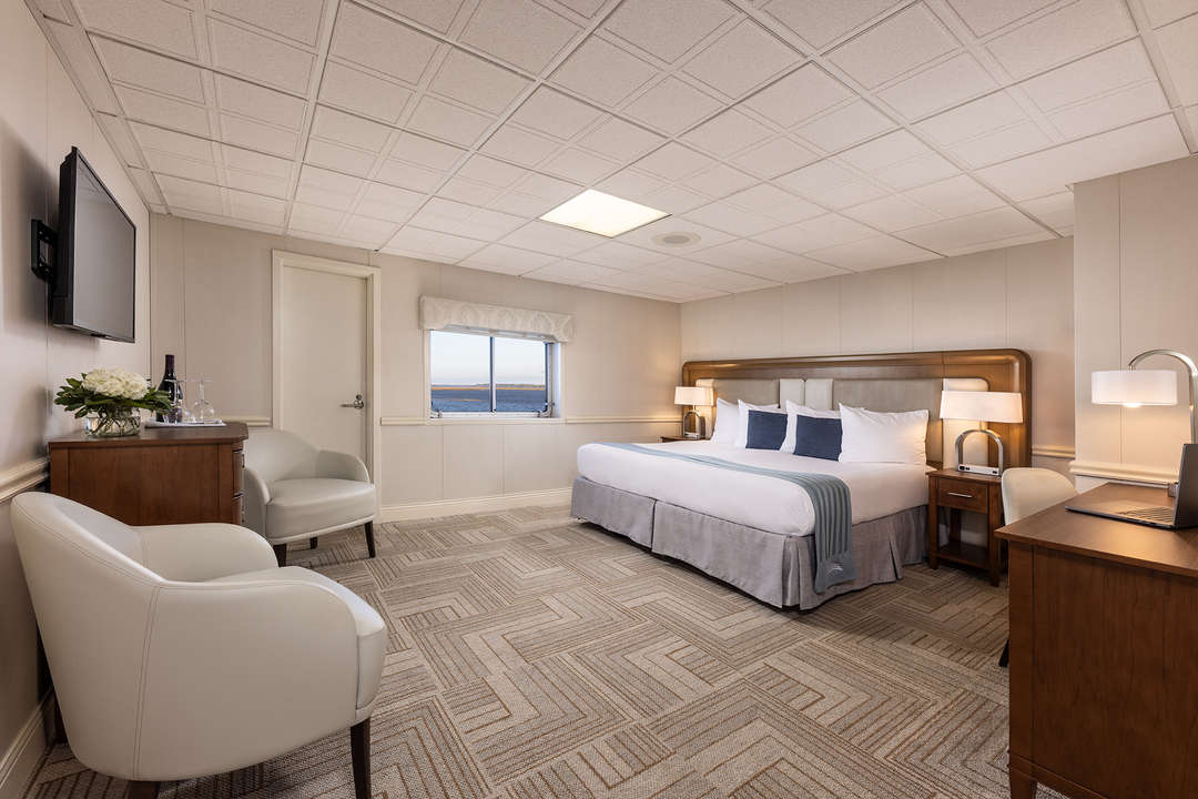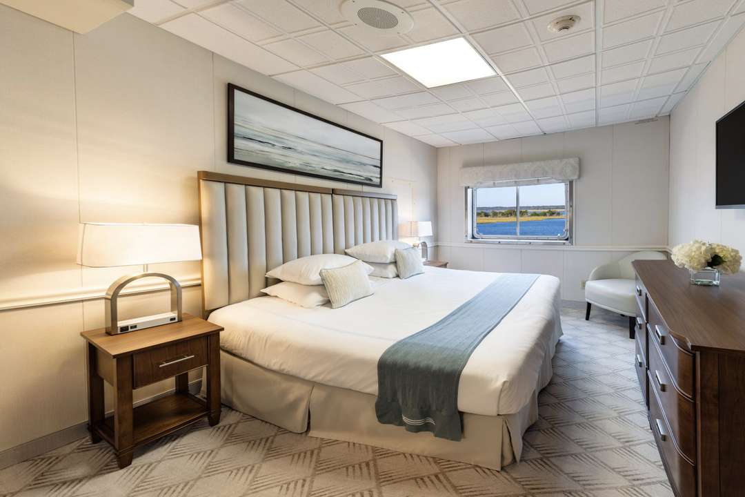 Standard Waterview rooms are 258 sq. ft. with a large picture window. Staterooms have a king-size bed but can be configured with twin beds. Each bedroom also has a lounge chair, desk, dresser, and small closet, along with individual climate control and a single-serve coffee brewer. The private bathroom has a full-size shower and is equipped with toiletries, a hairdryer, plush towels, and grab rails.