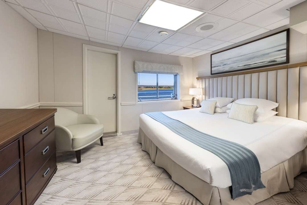 The American Independence is a classic coastal cruise ship hosting up to 90 guests. Cabins range from Standard Waterview rooms to Deluxe Balcony staterooms and expansive Veranda Suites, many featuring private balconies and generous living space. Each stateroom includes individual climate control, a coffee machine, a private bathroom, and comfortable seating areas, while suites offer additional touches, such as stocked minibars, champagne service, and balcony seating.