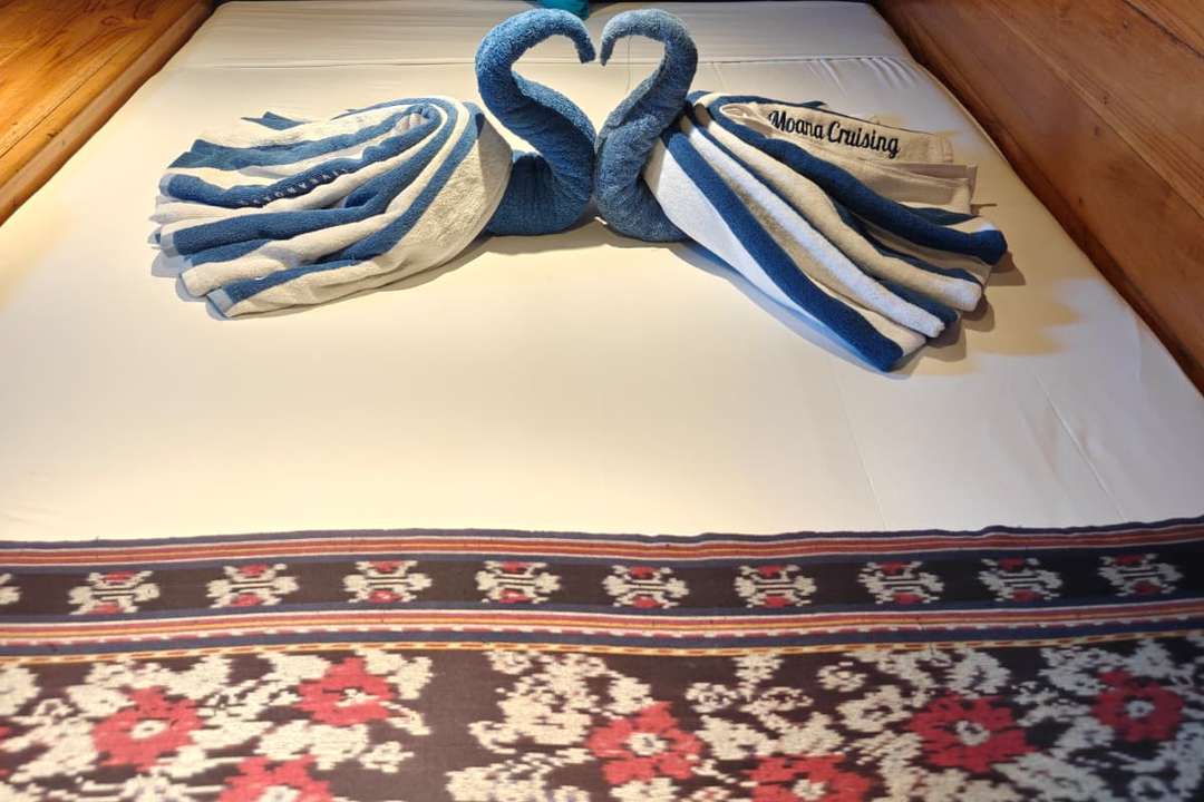 Mit nur fünf klimatisierten Kabinen, die jeweils über ein eigenes Badezimmer verfügen, verspricht eine Tauchsafari auf der Moana eine entspannte und familiäre Atmosphäre. Maximal finden zehn Taucher an Bord Platz. Auf dem obersten Deck befindet sich ein gemütlicher und klimatisierter Salon, sowie ein großflächiger Außenbereich, der sich optimal zum Entspannen zwischen und nach den Tauchgängen eignet. Für die ganz naturverbundenen Passagiere gibt es sogar Decken, damit Sie unvergessliche Nächte unter freiem Sternenhimmel verbringen können.