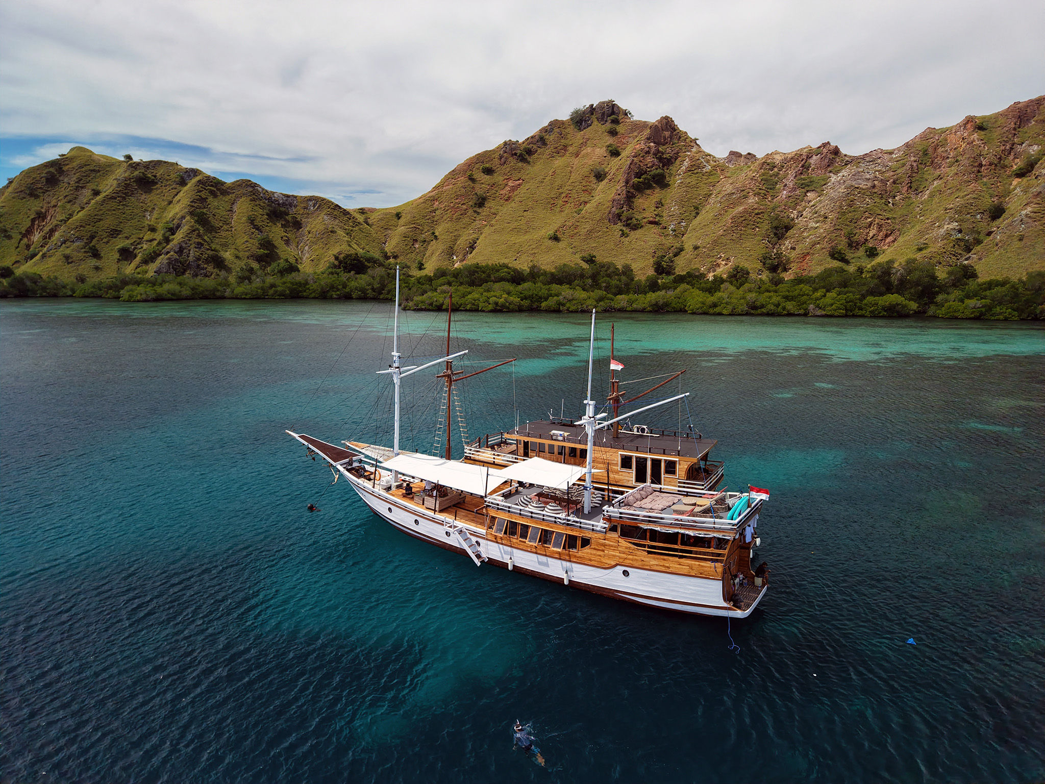 The phinisi is a two-masted wooden schooner traditionally built by the Bugis people of South Sulawesi in Indonesia. For generations, these vessels were used for trade and long-distance cargo transport across the Indonesian archipelago. Today, that same distinctive silhouette — twin masts, sweeping bow, and handcrafted wooden hull — defines some of the most beautiful liveaboards in the world.