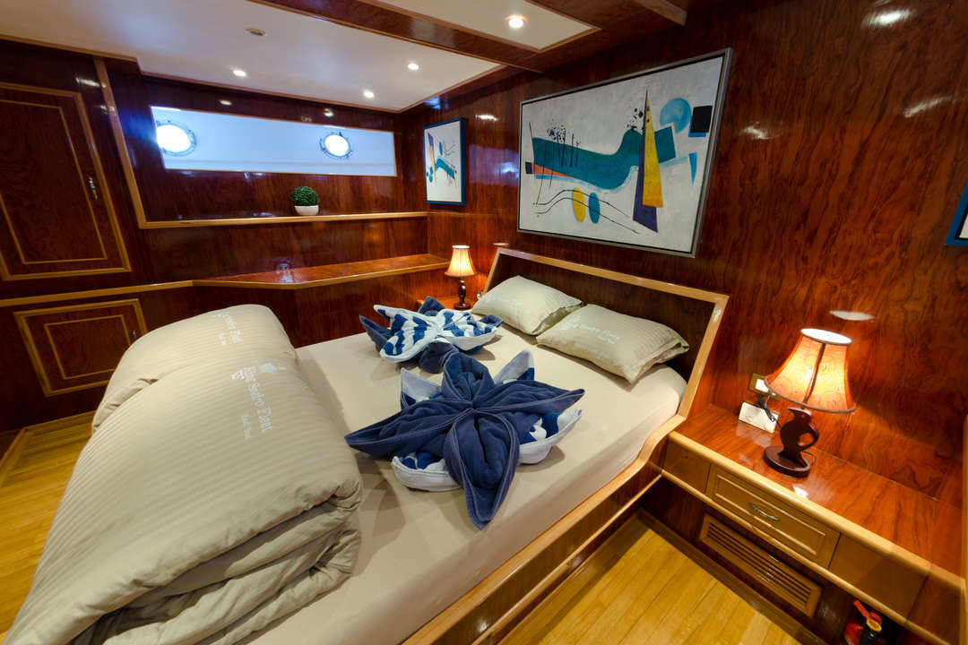 The 29m MV Snefro Pearl Liveaboard Egypt is perfect for small groups of up to 12 divers. On the lower deck are four twin cabins with side-by-side beds and one master suite with a double bed. There is also one twin cabin on the upper deck. All cabins feature individually controlled air-conditioning, private en-suite bathrooms, and a personal safe. The dining area with amazing panoramic views is located on the main deck and is where a variety of freshly prepared dishes with a combination of Egyptian and international cuisine will be served buffet style. Snacks are available throughout the day along with water, tea, coffee, and a selection of soft drinks. For relaxation, the MV Snefro Pearl Liveaboard offers a spacious salon with a modern entertainment system, or head on to the upper deck where there is a second air-conditioned lounge with a bar. There is also a partially shaded sun deck with a fully equipped bar.
