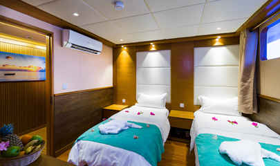 The Divescape Cruiser offers a comfortable stay for up to 24 guests across 12 ensuite cabins. Accommodation options include sea-view double cabins on the upper deck, a twin cabin on the main deck, and a mix of double, twin, and triple cabins on the lower deck. Each cabin features individually controlled air conditioning, a private bathroom with hot/cold water, a minibar, a safe, and ample storage space. All rooms include daily housekeeping, reading lights, and European-style outlets (220V).
