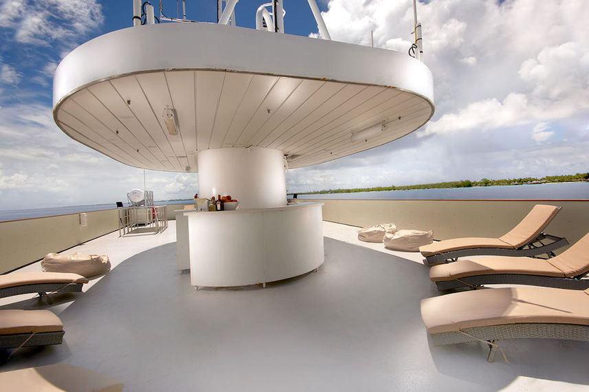 For relaxation and comfort, the French Polynesia Master offers guests plenty of space on board. This includes an indoor lounge with entertainment system, outdoor shaded lounge area located on the upper deck and also a spacious sun deck offering stunning French Polynesia views. There are 13 cabins spread over 3 decks to cater to 25 people on board. Guests can choose between standard or premium cabins. Each cabin is equipped with en-suite bathrooms and individual AC units.