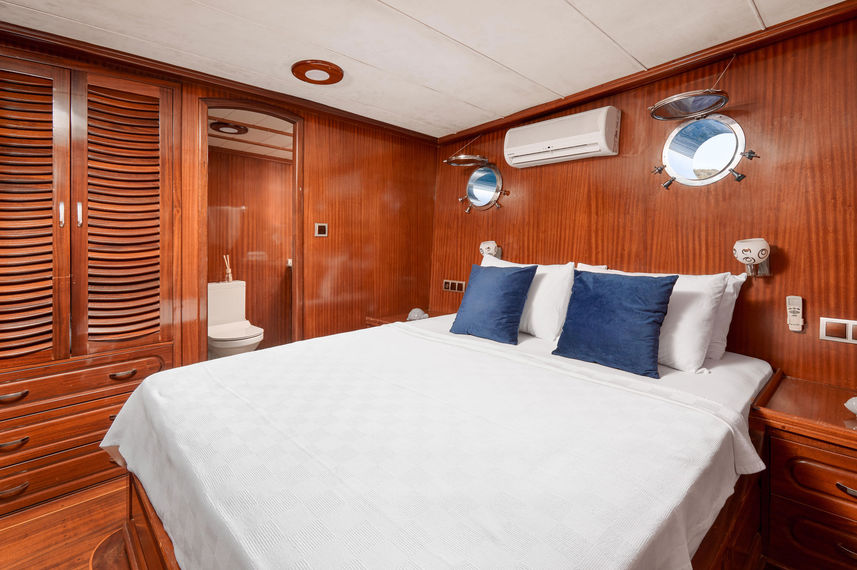 Tiene 6 cabinas situadas en la cubierta inferior equipadas con camas dobles o gemelas, luces de lectura, portillo, espacio de almacenamiento y baño privado. También hay 2 cabinas Master que ofrecen mayor espacio y un sofá. La cubierta principal cuenta con lounge al aire libre y con una zona para comer, los cuales son perfectos para disfrutar de la vista y de las comidas. También hay un comedor interior y un bar.