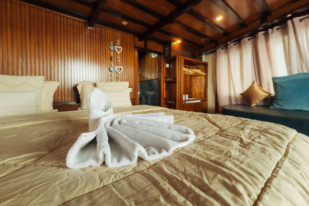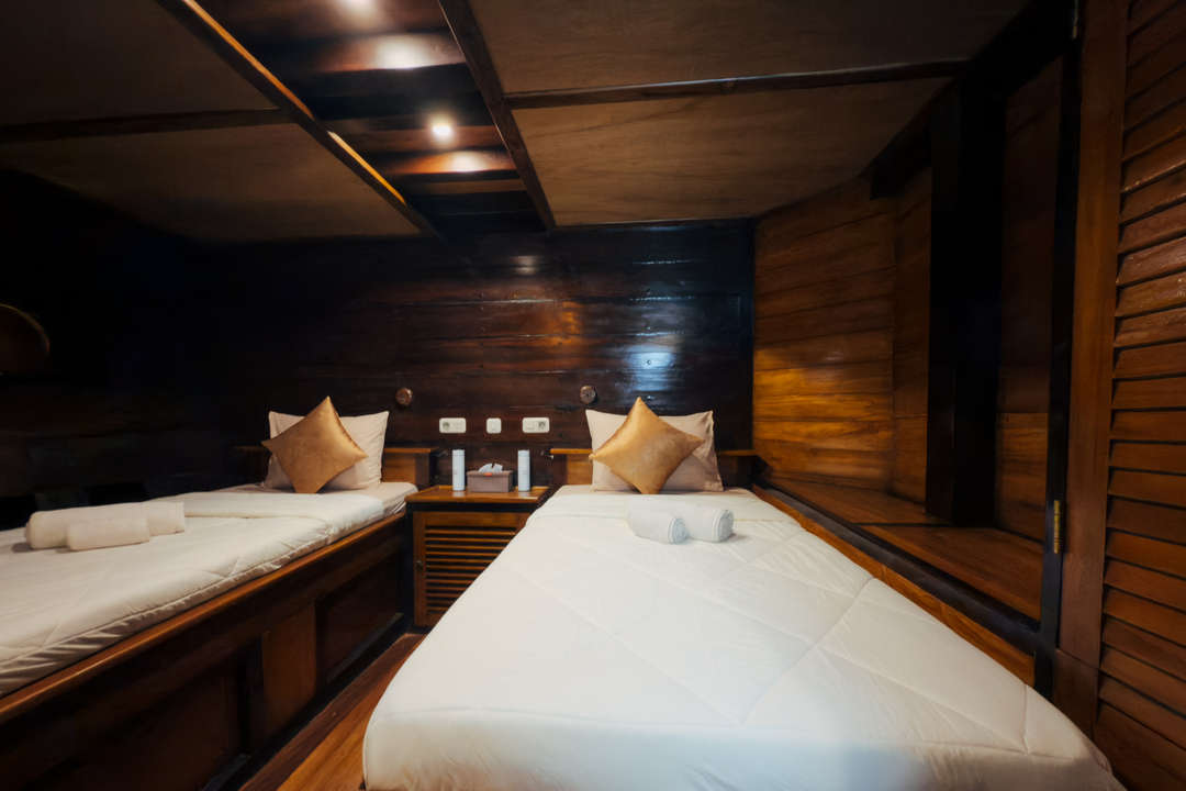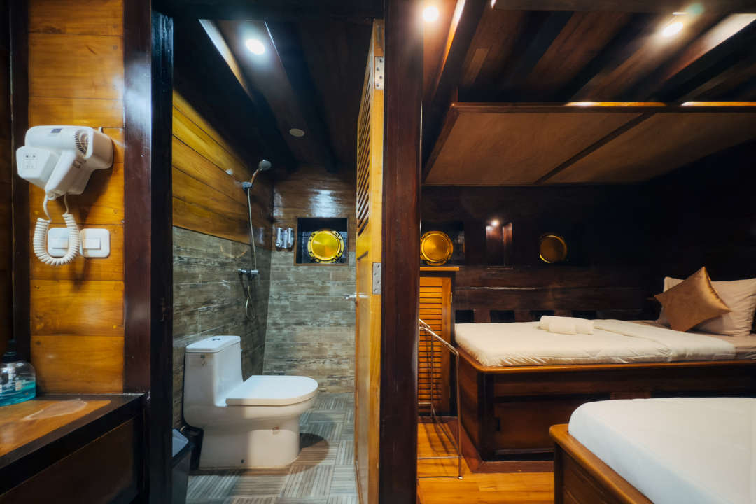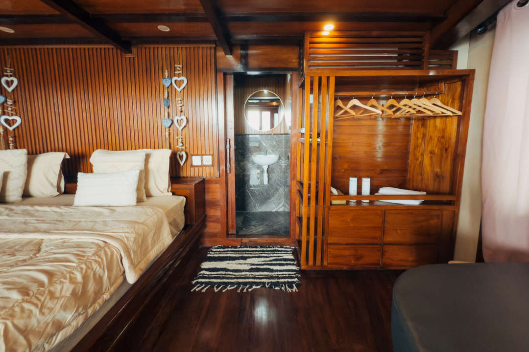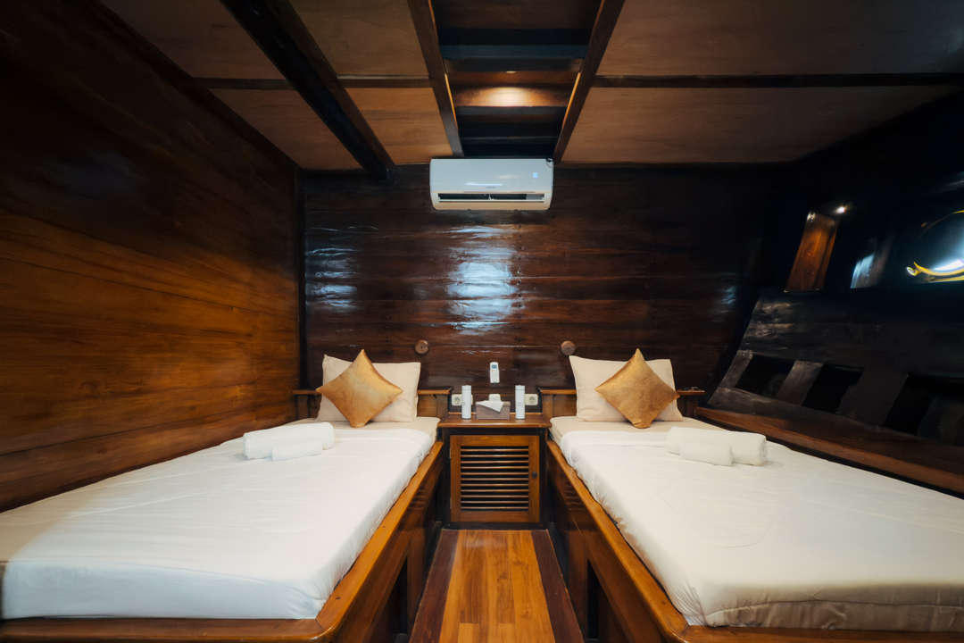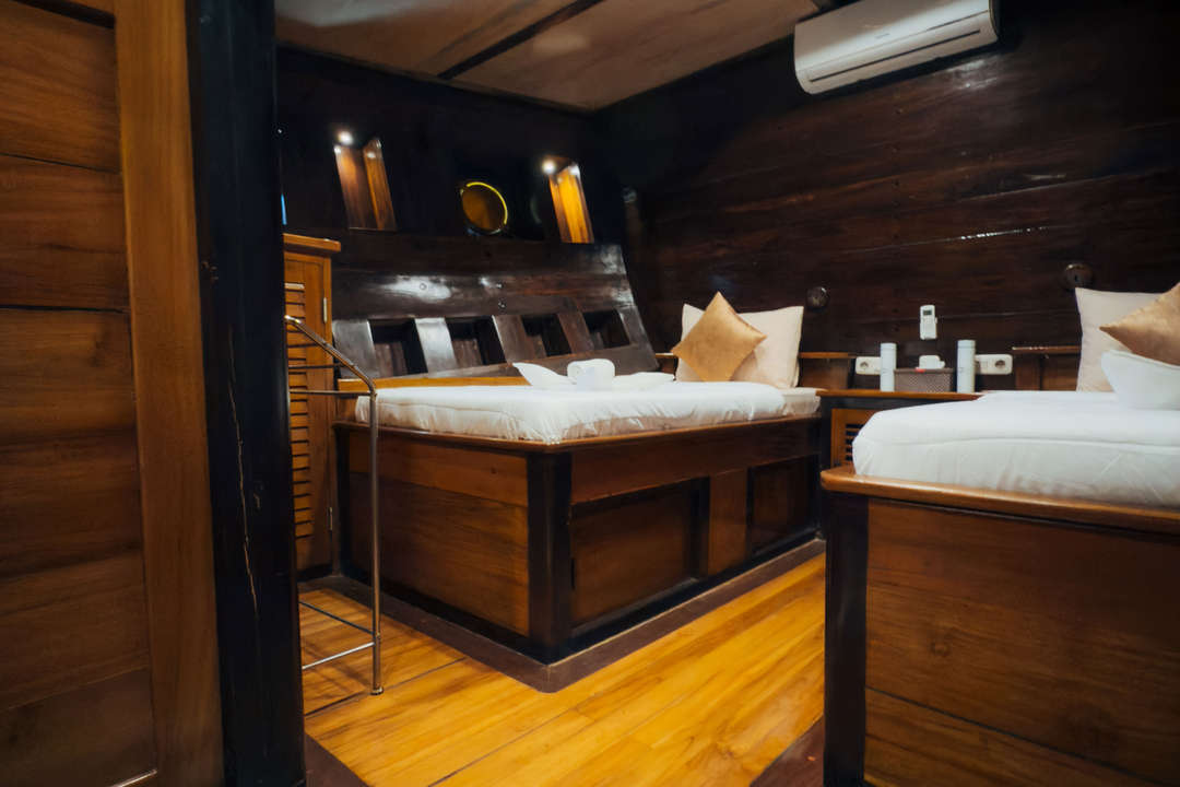 Hatiku is a traditional Pinisi, built in 2014 and purpose-designed for intimate dive expeditions with around 12–14 guests. The boat offers 7 cabins, including a Master Cabin on the main deck. Below deck, 6 twin-share cabins all feature en-suite bathrooms and air conditioning. Quality bedding, hot showers, and efficient daily housekeeping make Hatiku feel like a relaxed floating lodge in the heart of Indonesia’s Coral Triangle.