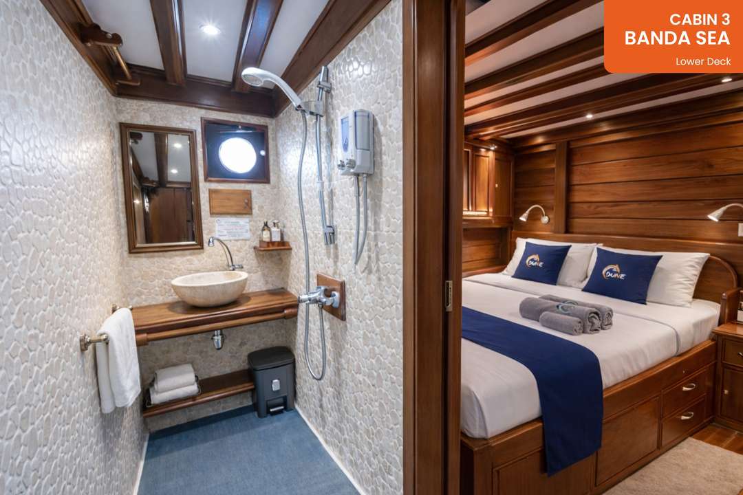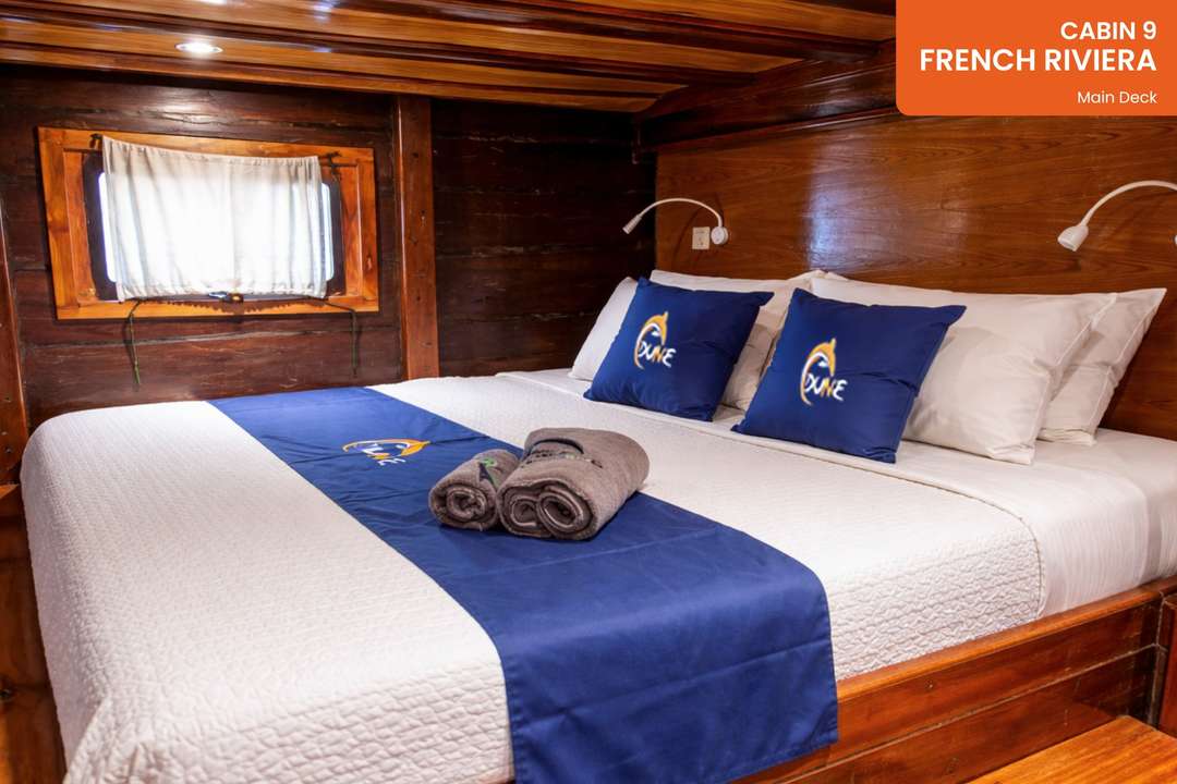 DUNE Aurora는 Sulawesi에서 제작된 42미터의 전통 피니시 리브어보드입니다. 최대 18명의 손님을 수용할 수 있으며, 각 객실은 에어컨, 실내 욕실, 무료 Wi-Fi, 매일 객실 청소 서비스가 제공되는 9개의 더블 또는 트윈 캐빈으로 구성되어 있습니다. 손님들은 하부 갑판에 있는 스탠다드 캐빈이나 메인 갑판에서 바다 전망을 즐길 수 있는 슈페리어 캐빈 중에서 선택할 수 있습니다. 19명의 전문 승무원이 항해 내내 세심한 서비스를 제공합니다.