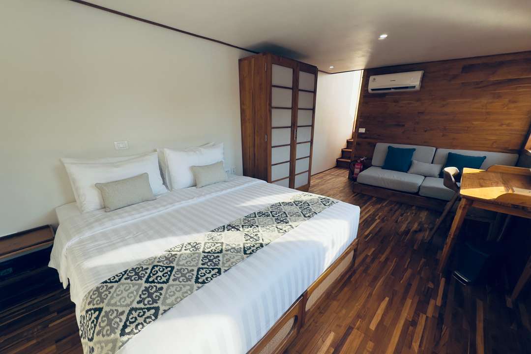 De Naga Biru biedt plaats aan maximaal 16 gasten in 7 hutten, waaronder Single, Superior, Deluxe en Grand Deluxe. Elke hut beschikt over een eigen badkamer met douche met warm en koud water, individueel regelbare airconditioning en een bureau. Sommige hutten bieden extra's zoals een eigen balkon of een ruim terras met ligstoelen, perfect om tussen de duiken door te ontspannen of gewoon te genieten van het adembenemende zeegezicht van Indonesië.
