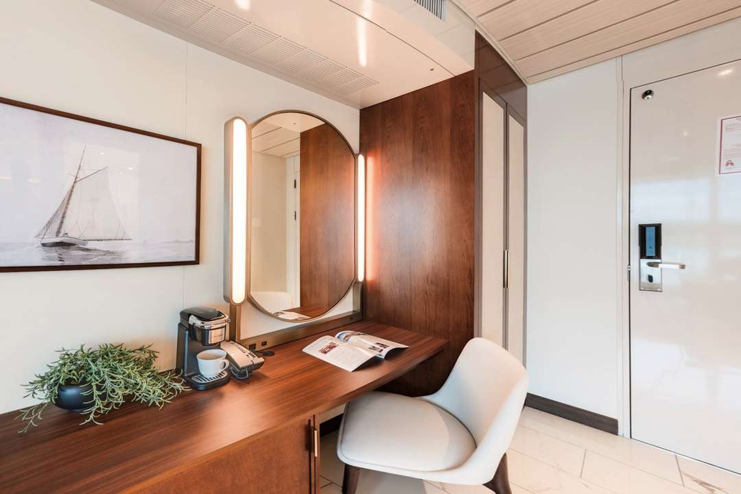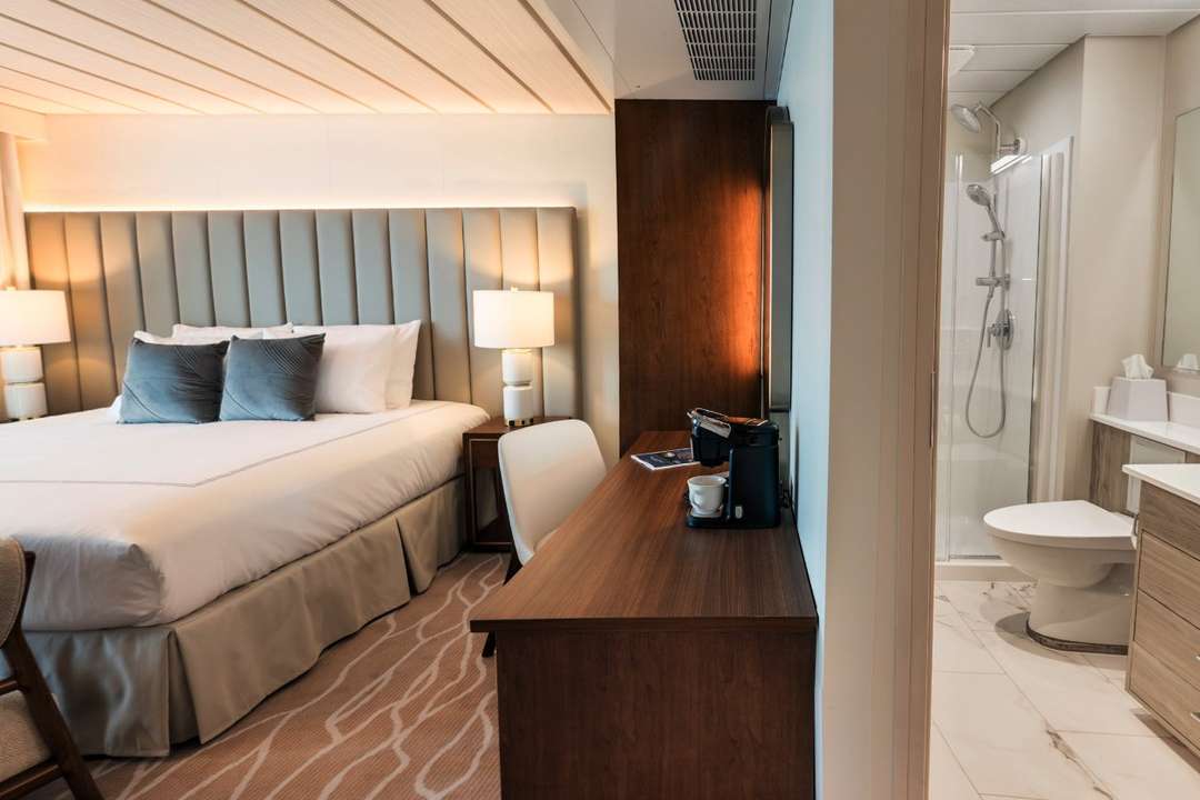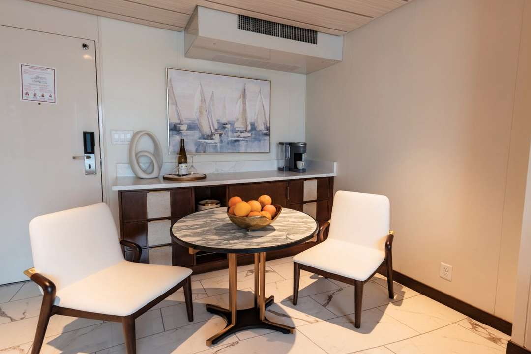 Estas suítes excepcionais têm 43,6 m² e possuem janelas do chão ao teto que dão para uma espaçosa varanda privativa com mesa e cadeiras. Cada suíte tem uma área de estar confortável e uma TV de tela plana, além de um balcão de café da manhã com um refrigerador abastecido. Estão disponíveis configurações de cama king ou camas de solteiro. O banheiro possui uma pia dupla com um chuveiro grande e está equipado com artigos de higiene pessoal, secador de cabelo, toalhas macias e roupões. O espaço de armazenamento em cada Sky Suite inclui um guarda-roupa, cômoda de tamanho normal, armário sob o balcão e gavetas de escrivaninha. Cada suíte também tem controle climático individual, cofre, portas de carregamento USB e Wi-Fi de cortesia.