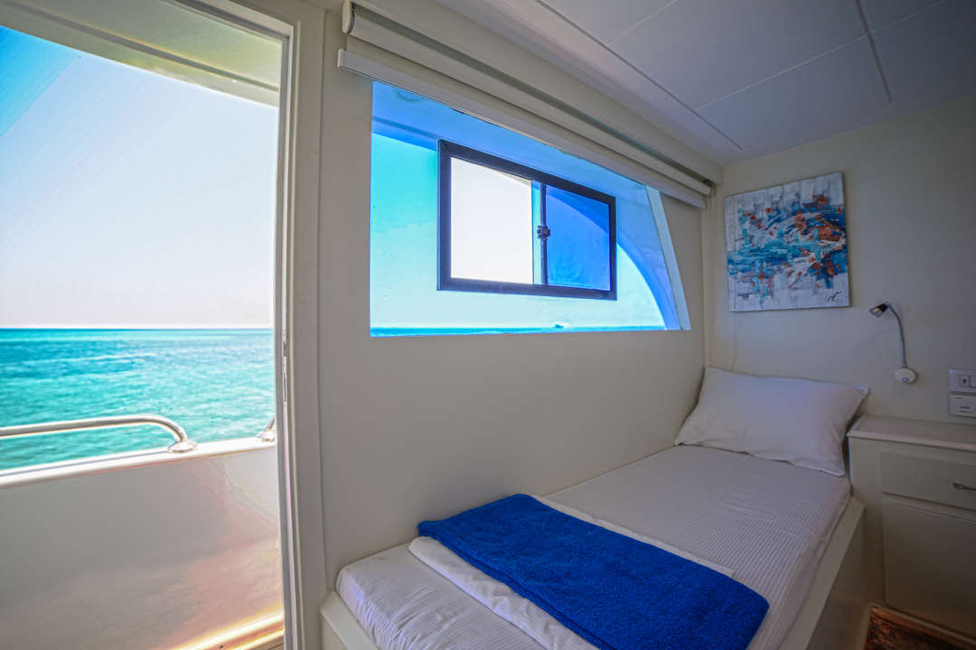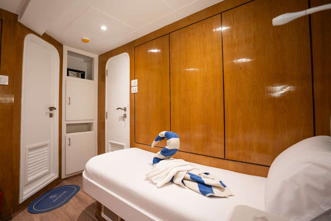 The Lady M is a 30-meter (100-foot) liveaboard accommodating up to 22 guests across 12 cabins. Each cabin offers a relaxed retreat between dives, supported by comprehensive safety, navigation, and emergency equipment for worry-free travel. Fully rebuilt and relaunched after an extensive renovation, the vessel now meets contemporary liveaboard standards while preserving the character that made her one of the Red Sea’s early safari pioneers.