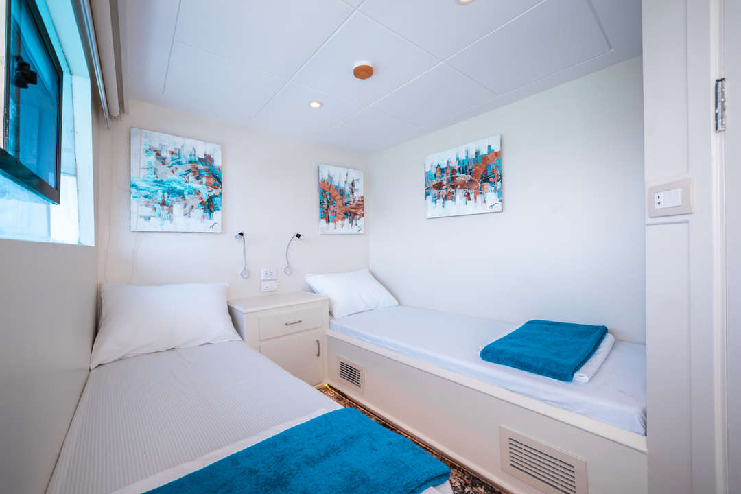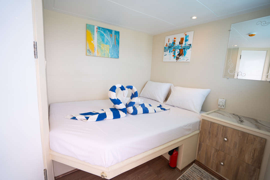 Onboard, divers will find a shaded dive deck, tenders for easy access to sites, and warm-water showers for comfort between dives. The boat features nitrox (subject to availability), a charging station, and reference materials, such as fish ID books. Guests can enjoy Wi-Fi connectivity and unwind in shared lounges between meals, where freshly prepared dishes are served. Recreational spaces provide plenty of room to relax and socialise after a full day of diving.