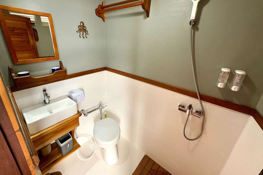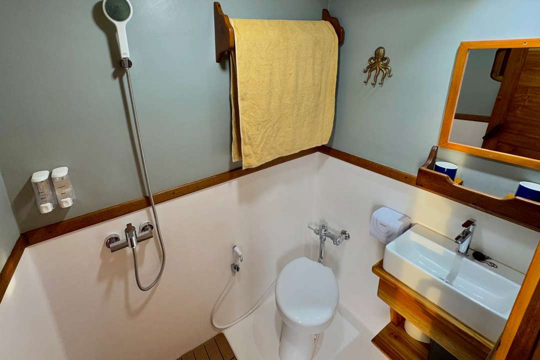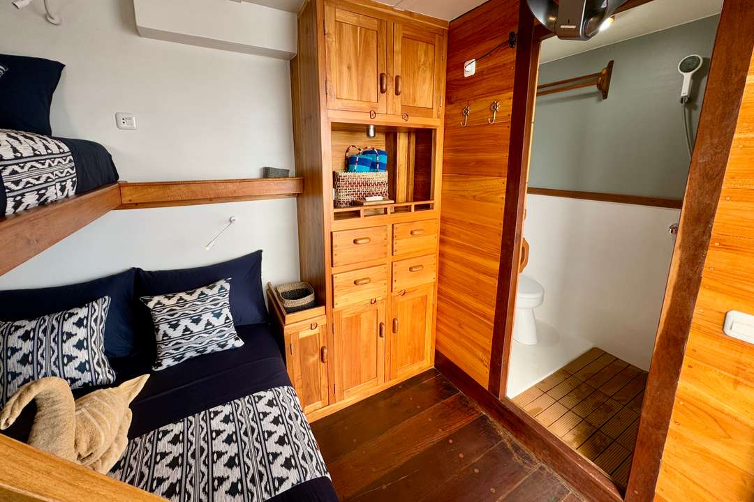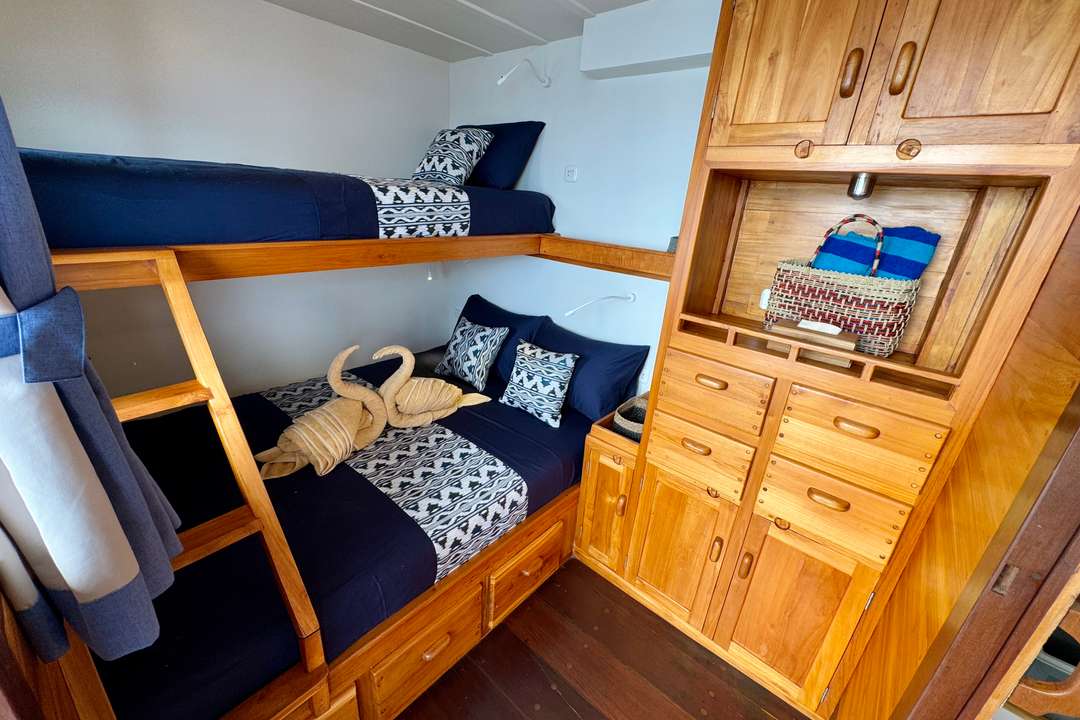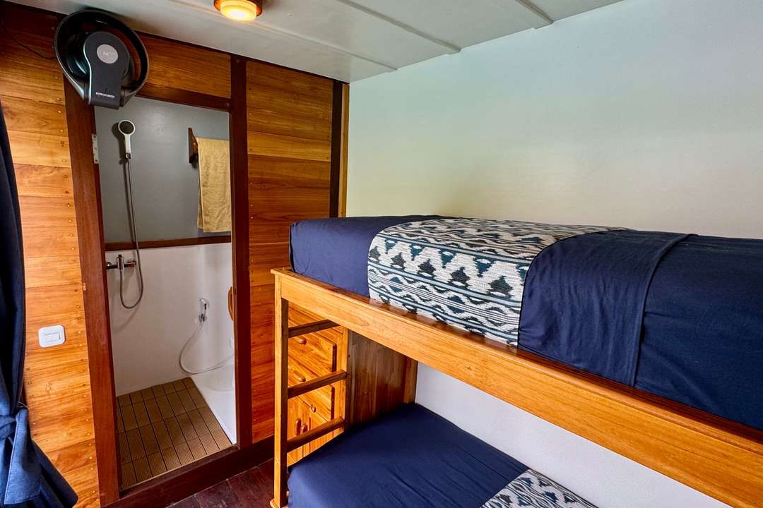 The Bajau 提供 4 间隔热良好、自然通风的主甲板船舱,可容纳 10 位宾客——包括 2 间配备双人床和上铺的三人舱,以及 2 间配备上下铺床的双人舱。每间船舱均配有私人浴室、吊顶风扇、大窗户享有海景、书桌、阅读灯、充足的储物空间、环保洗浴用品和每日清洁服务。开放式设计无需空调即可保持舒适与可持续性。