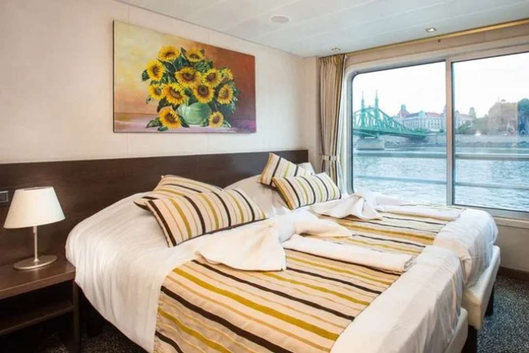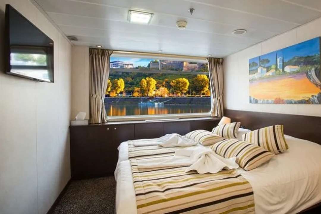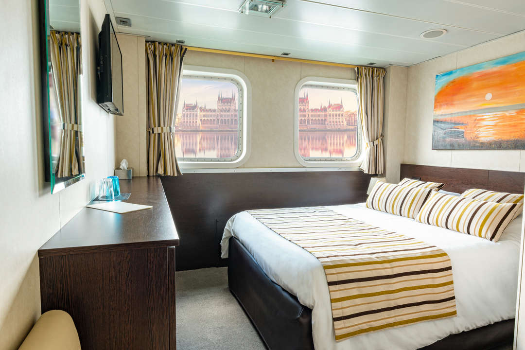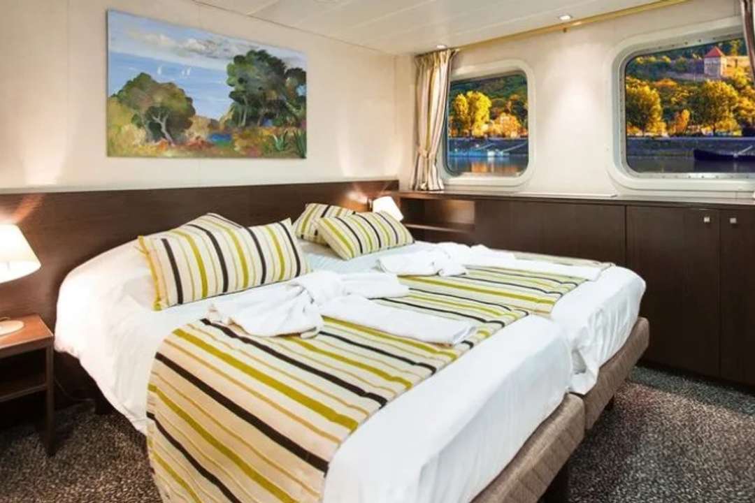 维瓦尔第号是一艘河轮船,可容纳最多176名乘客,共设有88间舱房,分布在三个甲板上。每间舱房面积为9至13平方米,配备独立空调、带淋浴的私人浴室、卫星电视、保险箱和无线网络。上层甲板的舱房设有带滑动窗的法式阳台;中层和主甲板的舱房则配有观景窗或高窗,确保所有乘客都能饱览多瑙河沿岸的美丽风光。